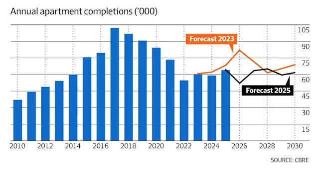 The number of new apartment completions will drop from 64,031 last calendar year to 52,505 – well below the 81,880 homes the commercial real estate agency forecast two years ago.